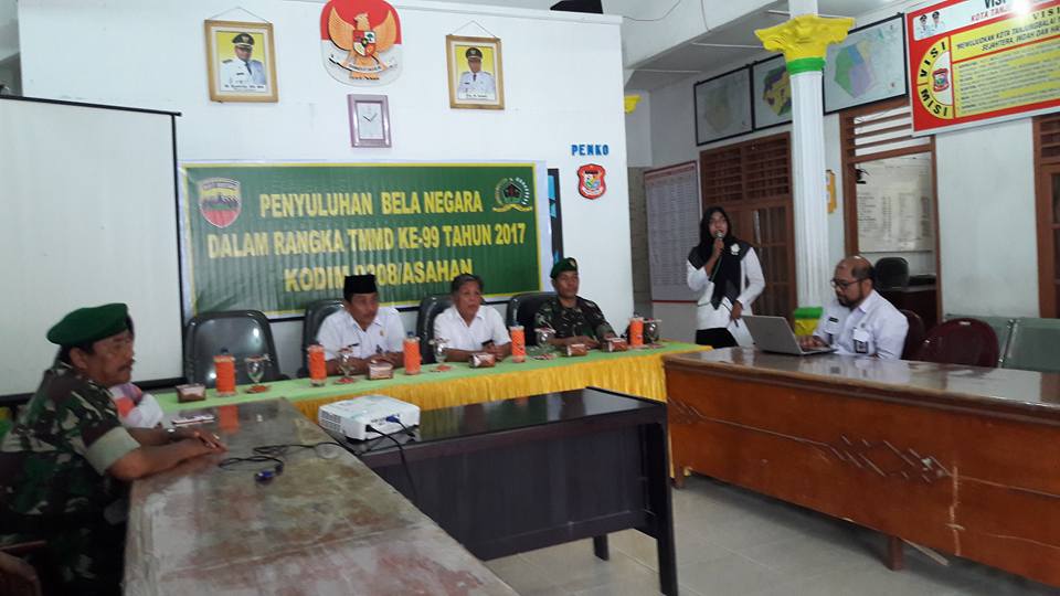 Dalam rangka TMMD ke – 99 Tahun 2017 yang diselenggarakan oleh Kodim 0208/AS melakukan Kegiatan Penyuluhan Bela Negara yang diadakan di Aula Kantor Camat Datuk Bandar Kota Tanjungbalai (Rabu/19/07).Kegiatan dibuka langsung oleh Camat Datuk Bandar dan sebagai Narasumber adalah Sekretaris Badan Kesbangpol Bapak Agustoni, S.Pd